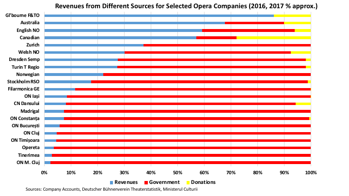 The budgets of the music institutions are almost completely covered by the subventions from the ministry. But let’s see more clearly what is the percentage of their own revenues for some Romanian music institutions and let’s compare this to the average sized opera theatres in the West. We will not talk about Covent Garden, Wiener Staatsoper or Opéra de Paris, and we will make the comparisions with the opera houses in Torino, Zürich, Stockholm etc. Nevertheless, it is worth mentioning that, in 2017, the three music institutions more or less directly managed by the interim manager of the Bucharest National Opera (which is Iasi Opera House and the Operetta and Musical Theatre) received a total subvention of nearly 22 mil. €, very comparable to the 25 mil. £ the Royal Opera House receives from the Arts Council.