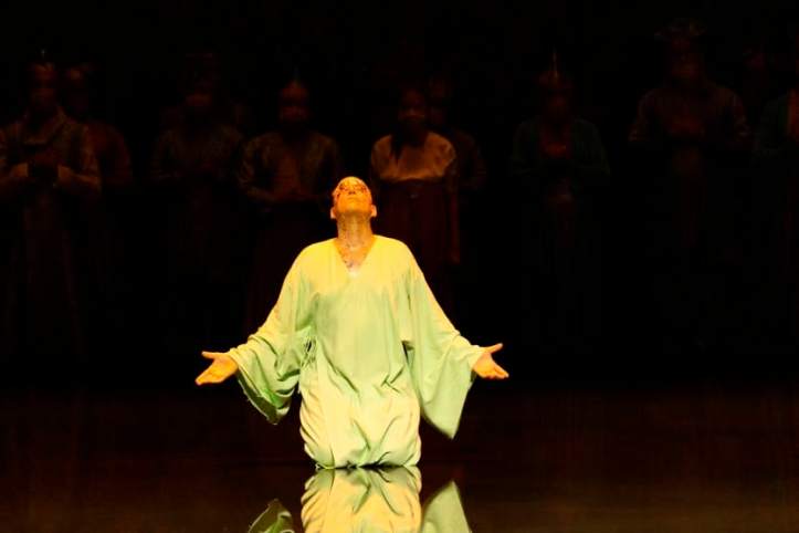I had already known Christopher Maltman from the radiocast of the performances in Salzburg and, even though he is vocally very good, I could not imagine him as Œdipe. At least from the reviews and photos of Fryer’s production, as Rocky Balboa boxing with the destiny, the character’s humaneness seemed simplified. In Paris, he had an endearing complexity. He was not as imposing as Johan Reuter in London, but his voice supported the part very well, swinging between a baritone high register and very steady bass low notes. As he had to be on stage and to sing for three whole acts, Maltman evenly distributed his voice, and gave up the explosions, by replacing them with strong accents in the Sphinx scene and in the end of the third act. Here, Mouawad had the inspiration of not using the image of blood running down the hero’s face after self-blinding, and metaphorically replaced it with glittery confetti, an inorganic material that contrasted with the life in the vegetal hairdos of those around him. And the difficult final scene, when the hero disappears in light, was simply solved, with Œdipe falling asleep in fetal position, in the middle of a large, illuminated water scene.