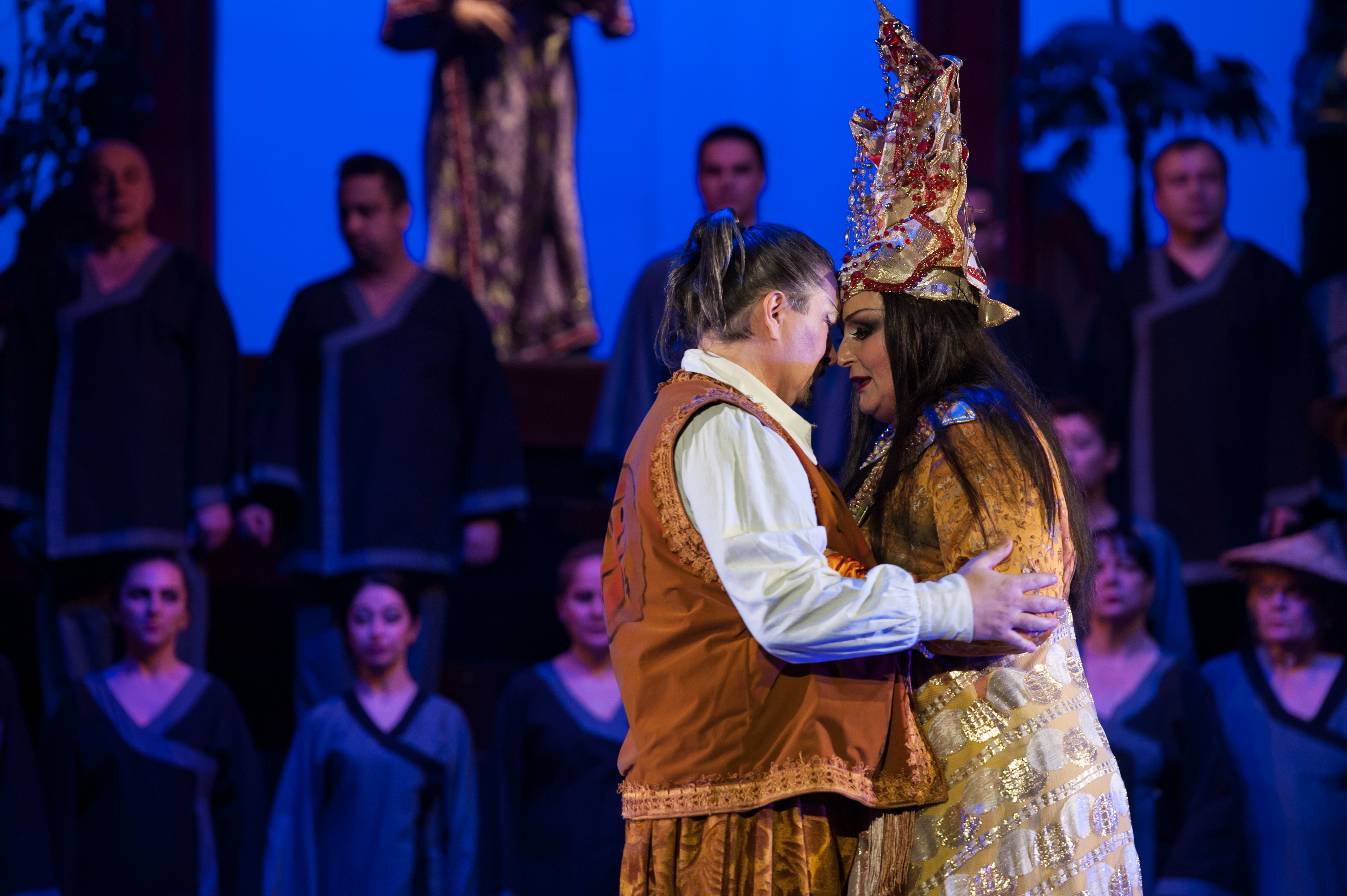 Iréne Theorin started to sing In questa reggia and from here on everything was different. Epic, I would say, something to talk about not only after the performance, but even next year. In 2009, when she was debuting in Andrei Șerban’s production at the Royal Opera House, the critic from Opera wrote she is the best Turandot since Gwyneth Jones (in 1984). I saw her at the ROH in 2013, and the impression she made was very strong. Last night she was as I had known her, nothing had changed. This ice princess cuts with her voice not only through any orchestra (and even more through the orchestra with 40 people, in Craiova), but, however high she goes with the aria, her timbre stays voluptuous and produces not only force, but also a personality that arrests the audience. Theorin is a soprano who manages to give roundness to a role that modernity can make impenetrable and schematic. Theorin manages to always give credibility to the end of the opera, when the ice princess turns into a princess in love. She is not only a wagnerian and superhuman voice landed in an Italian opera, she is also a mixture of force and femininity. In act II, Frediani coped with her with a bravery to remember, and then he delivered Nessun forma without any emotions, getting to the finish as a winner. This tenor just started his career a few years ago, and already jumped in the dramatic repertoire: he learned how to sing Luigi, from Il tabarro, by listening to the recordings with Vasile Moldoveanu, and he is confirming the research about dramatic spinto voices that explode late, but decisively.