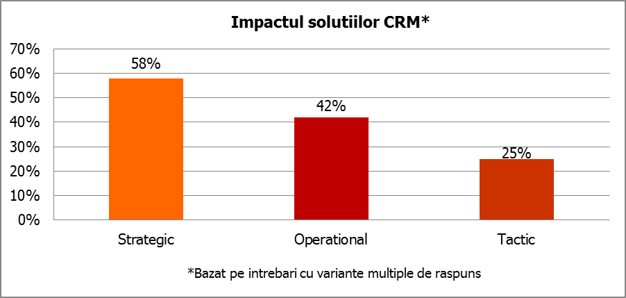 ** Studiul nostru releva faptul ca cele mai multe implementari CRM au o durata de 6-12 luni, in special daca ne referim la banci de marime medie si la implementari de module izolate. Pe de alta parte, daca ne referim la bancile foarte mari, putem observa implementari care au o durata mai lunga, de pana la 4 ani.